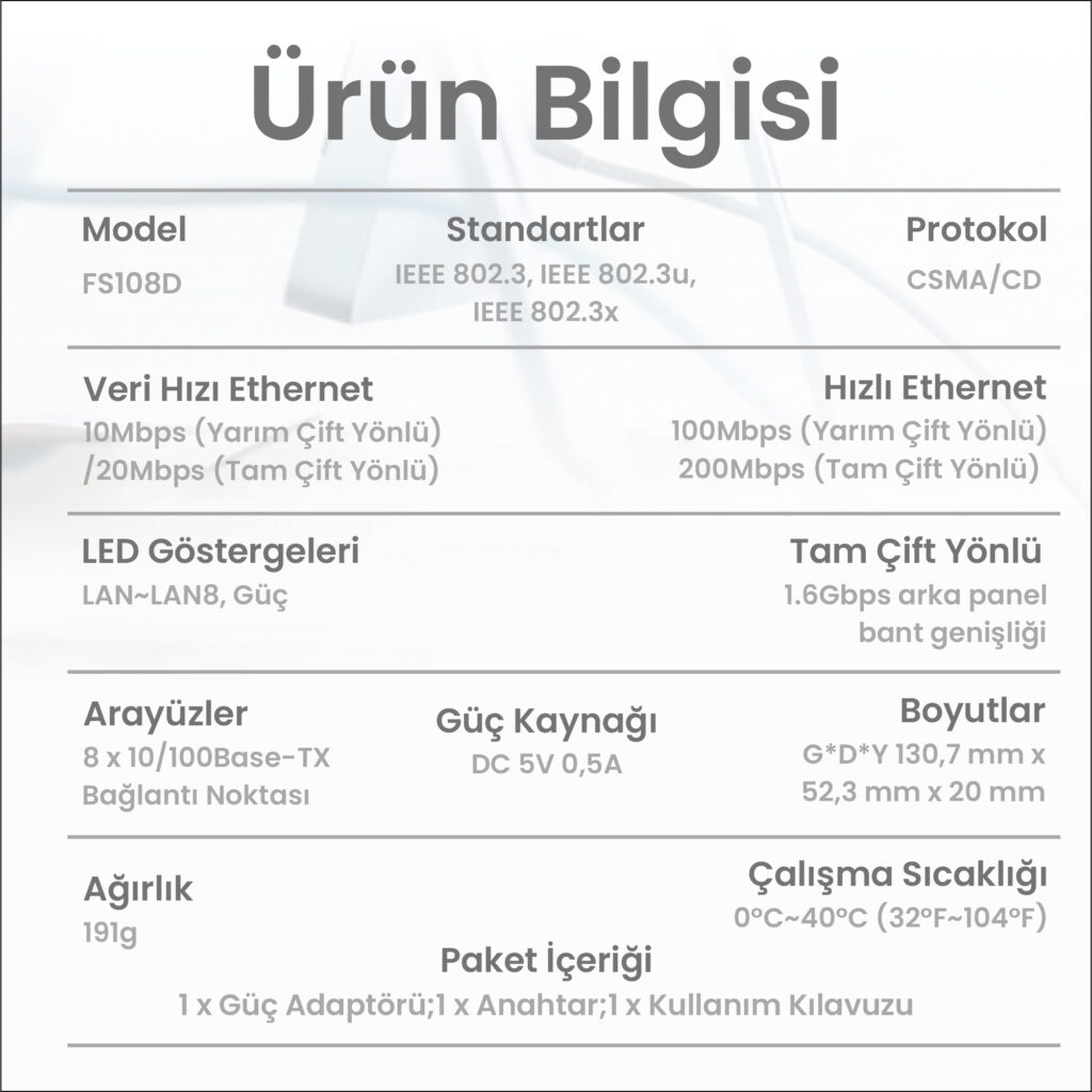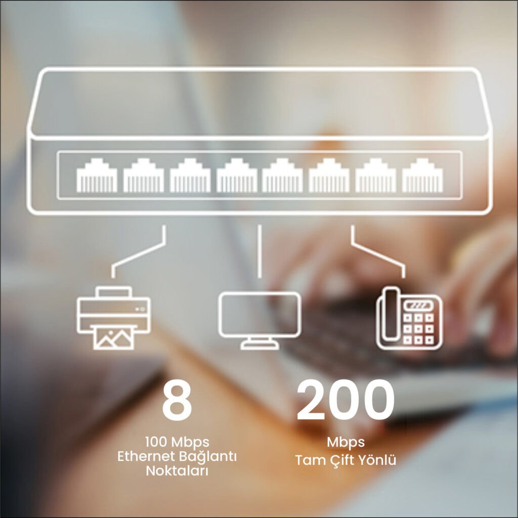 ● Auto-MDI/MDIX’i destekleyen 8 x 10/100Mbps Otomatik Anlaşmalı RJ45 bağlantı noktaları